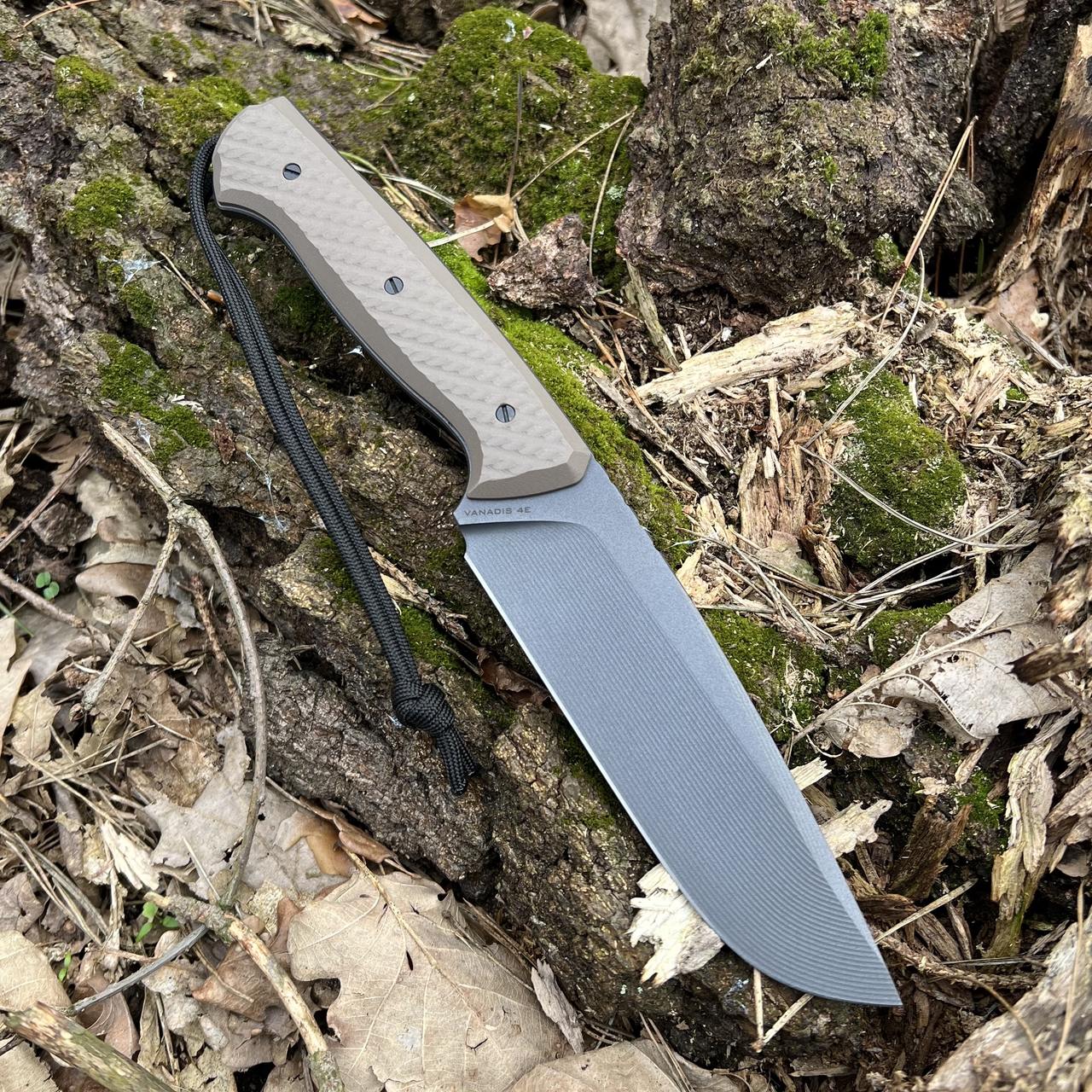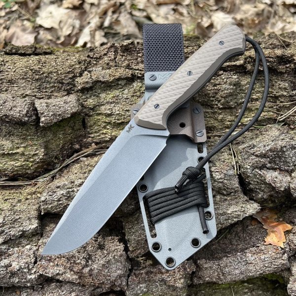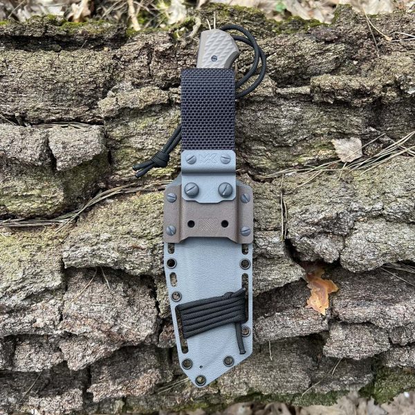 Presented knife has a PVD coated blade made of Vanadis 4 Extra premium steel and Earth Brown G10 handle. Knife comes with grey Kydex holster. The holster can be attached to MOLLE solutions, thanks to the additionally designed Kydex buckle.