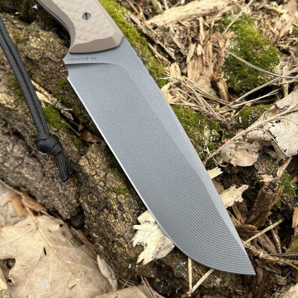 - Blade: fixed blade (full tang), drop point style blade with groove grind, plain cutting edge