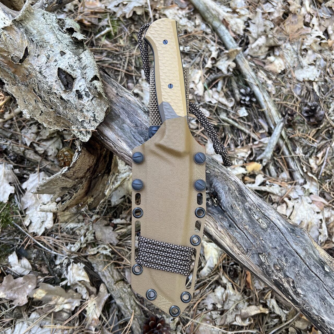 MK Knives & Tools Rambler “HGF2T #4” comes with blade made of excellent Elmax steel with black DLC coating. Handle scales are made of Coyote and Earth Brown G10. Knife comes with holster made of Coyote Kydex material with color additions.