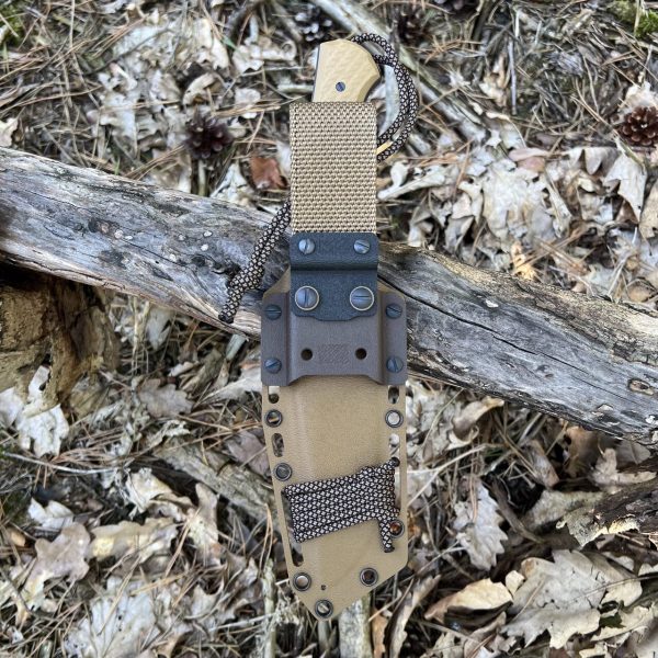 The holster is attached to the belt using a textile loop. It is equipped with pass-through holes that can be optionally used to secure the holster to a backpack or tactical gear using cordage, rope, or paracord. The holster is wrapped with paracord, matching the color of the section near the knife.