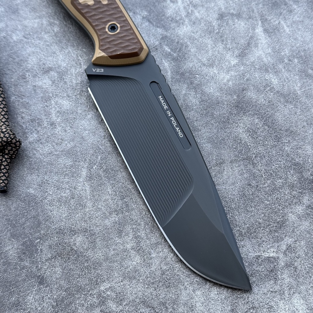 *The presented knife has a blade made of extremely durable Vandis 23 steel with excellent hardness (61-62 HRC), coated with a black DLC coating. The blade has a so-called double grind (DG), combining a groove grind in the central part with a flat grind in the rest. The blade near the spine is decorated with a double-sided fuller, reducing the weight of the blade.