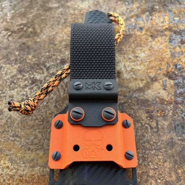 MK Knives & Tools Rambler “Postapo” knife comes with blade made of Vanadis 4 Extra steel, which is exceptionally resistant to overload. Blade surface is black DLC coating. The knife blade with a drop point profile has been grooved (hollow grind) to obtain better cutting properties, and its tip is characterized by a flat grind emphasizing the penetrating abilities of the knife. The dorsal area of the blade is distinguished by a double-sided fuller. Handle covers made of black G10 composite with orange inserts to facilitate easier locating of tools. The knife comes with a black holster made of carbon Holstex with orange accents.