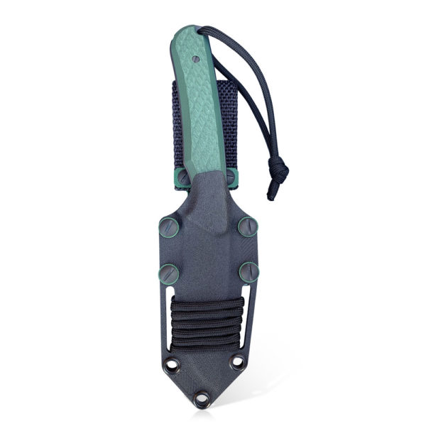 We attach the holster to the belt with the use of kydex buckles, which can also be attached to MOLLE solutions. The initial mounting of the buckles allows the entire belt to be mounted vertically. However, it is possible to change the position of the buckles in a way that allows for more discreet horizontal installation (along the belt, on the back or at the front on the hip belt). Then just unscrew the buckles and change their arrangement. Strongly stable fastening (if we prefer it) can be obtained additionally by tying the holster through the through holes in it. Of course, you can use the paracord supply that the holster is wrapped in (its color corresponds to the section at the knife).