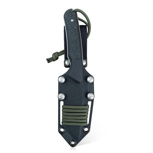 MK Knives & Tools Scout “Black Canvas Micarta” has a blade made of Elmax premium steel with glass blasted finish. Handle scales are made of black micarta with olive G10 liners. Included holster is made of black Kydex material with color additions. Besides standard nylon belt loop, holster is equipped in optional black Kydex buckle compatible with MOLLE solutions.