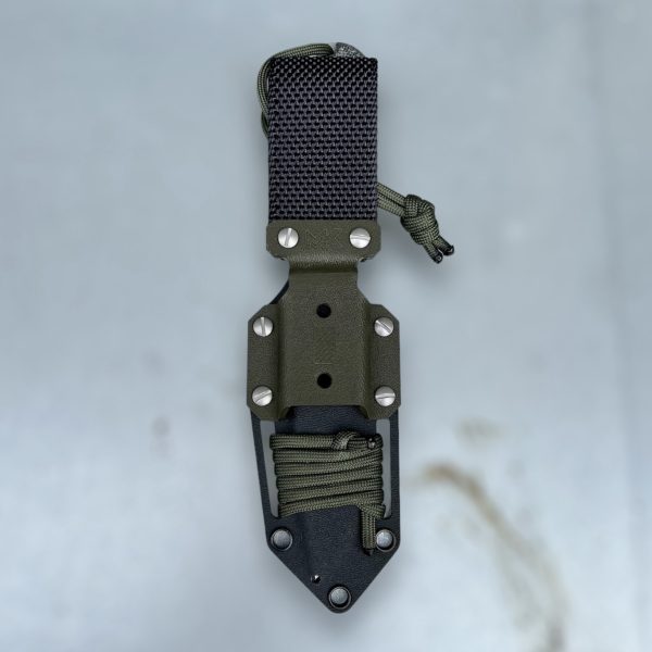 The holster can be carried in several ways. We attach it to the belt with a webbing grommet made of durable nylon. Mounting on a belt, but also on MOLLE solutions is ensured by an optional Kydex buckle added to the set*. The holster is equipped with through holes that can be used optionally to attach the set to a backpack or a tactical harness element with a rope, string or paracord. Of course, you can use a supply of paracord with which the holster is wrapped (its color corresponds to the section next to the knife).