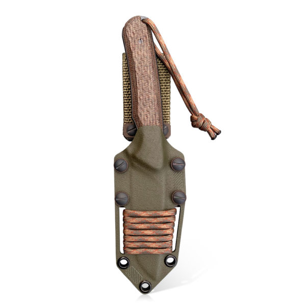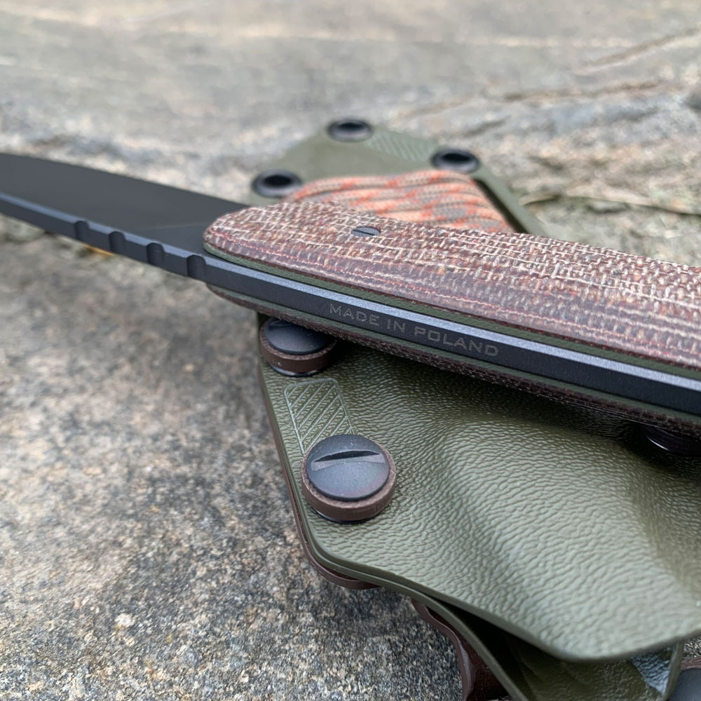 Presented MK Knives & Tools Scout “Neoteric” Knife has a blade made of Vanadis 4 Extra steel with a black PVD coating. The handles are made of brown micarta and olive G10 (spacers). The holster is made of green kydex material. Kydex can be mounted vertically or horizontally (along the belt, which allows for discreet carrying), thanks to a specially designed buckle compatible with MOLLE solutions.