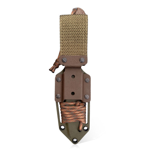 We attach the holster to the belt with the use of kydex buckles, which can also be attached to MOLLE solutions. The initial mounting of the buckles allows the entire belt to be mounted vertically. However, it is possible to change the position of the buckles in a way that allows for more discreet horizontal installation (along the belt, on the back or at the front on the hip belt). Then just unscrew the buckles and change their arrangement. Strongly stable fastening (if we prefer it) can be obtained additionally by tying the holster through the through holes in it. Of course, you can use the paracord supply that the holster is wrapped in (its color corresponds to the section at the knife).