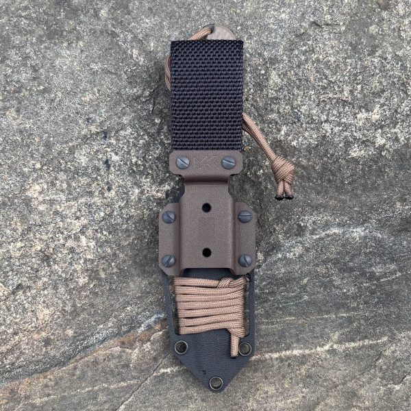 The holster is attached to the belt using a textile loop. It is equipped with pass-through holes that can be optionally used to secure the holster to a backpack or tactical gear using cordage, rope, or paracord. The holster is wrapped with paracord, matching the color of the section near the knife.