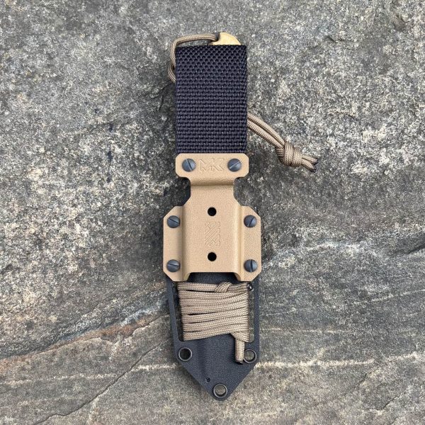 The holster is attached to the belt using a textile loop. It is equipped with pass-through holes that can be optionally used to secure the holster to a backpack or tactical gear using cordage, rope, or paracord. The holster is wrapped with paracord, matching the color of the section near the knife.