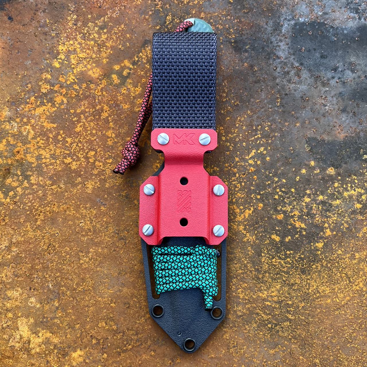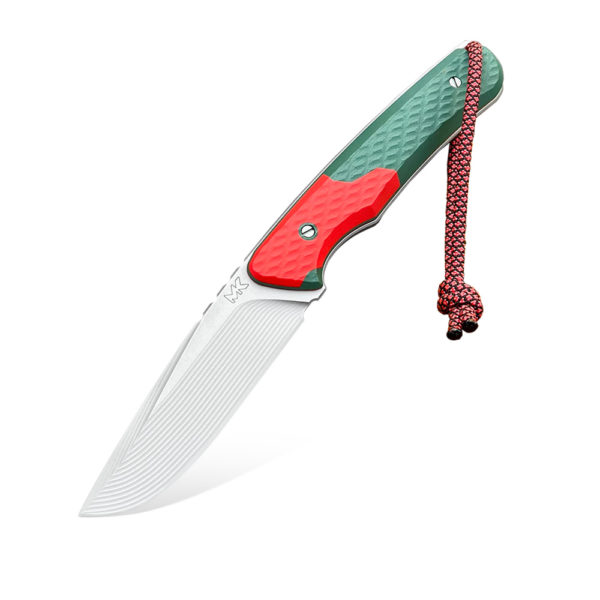 MK Knives & Tools Scout “R100R #2” has a blade made of extremely rust resistance Vanax premium steel with groove grind and a bead blasted finish. Handle scales are made of green and red G10 composite. Knife comes with holster made of black Kydex with red additions. Besides standard nylon belt loop, holster is equipped in optional Kydex buckle compatible with MOLLE solutions.