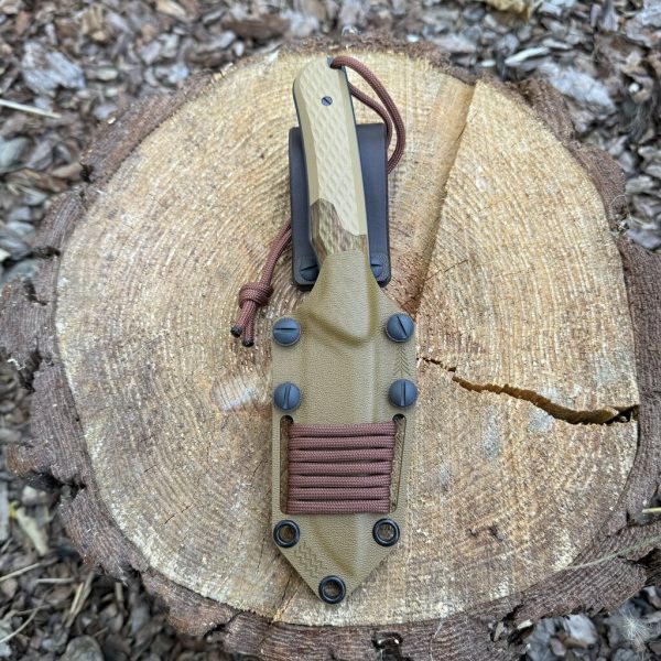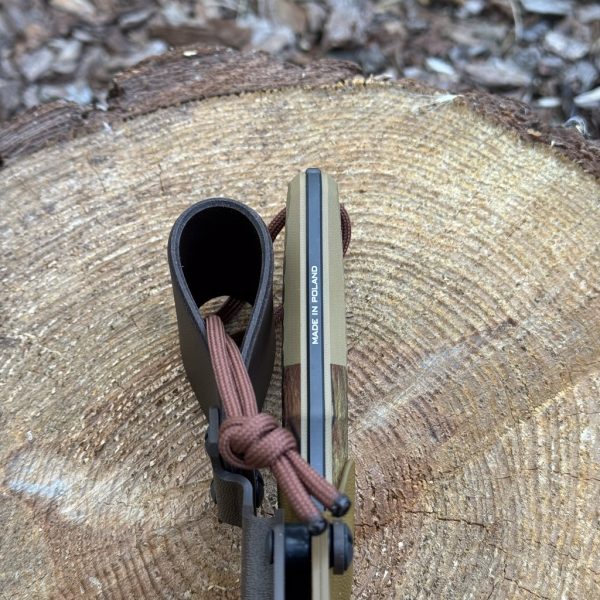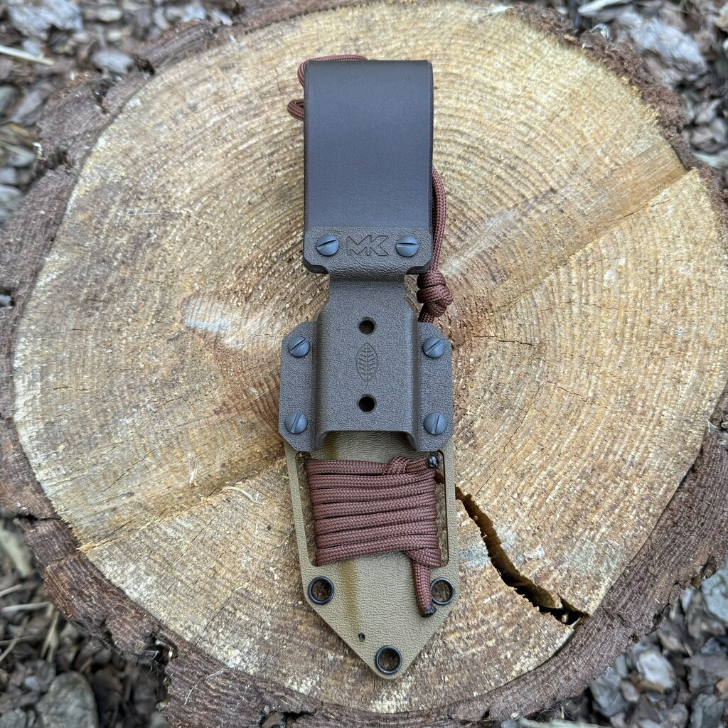 - Sheath: coyote Kydex holster with brown additions and leather loop