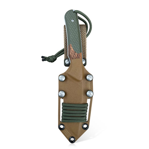 MK Knives & Tools Scout “Wood Spirit IV” has a blade made of Elmax premium steel with handmade horizontal satin. Handle scales are made of green G10 composite with brown liners and stabilized wood (walnut) inserts. Included holster is made of coyote Kydex material and decorated by pictograms (river, leaf). Besides standard nylon belt loop, holster is equipped in optional coyote Kydex buckle compatible with MOLLE solutions.