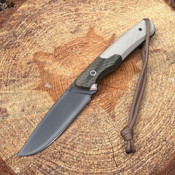 - Handle: Desert tan G10 + stabilized wood (walnut) inserts