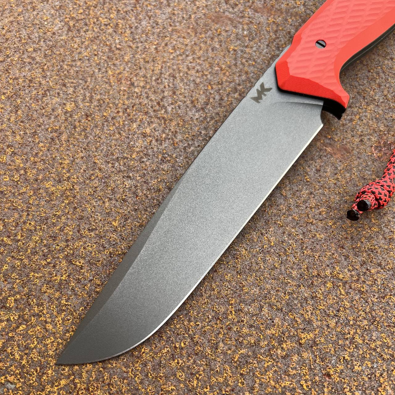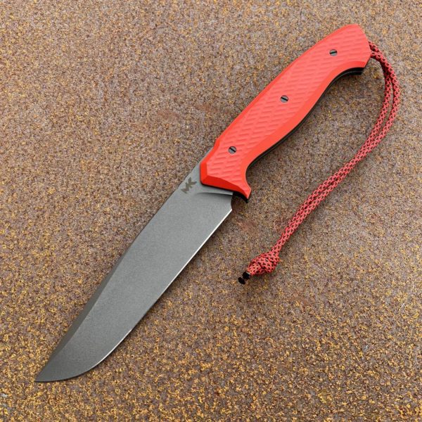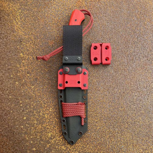 MK Knives & Tools“Daredevil” comes with blade made of extremely durable Vandis 4 Extra steel with great hardness (approx. 63 HRC). Blade is covered by black titanium PVD coating. The knife blade with a drop point profile has been made with a flat grind. The handle covers made of red and black G10 composite hide a pin for paracord or rope, etc. at the end of the handle. Knife comes with black Kydex holster with red additions and an additional buckle designed for mounting to the MOLLE system.