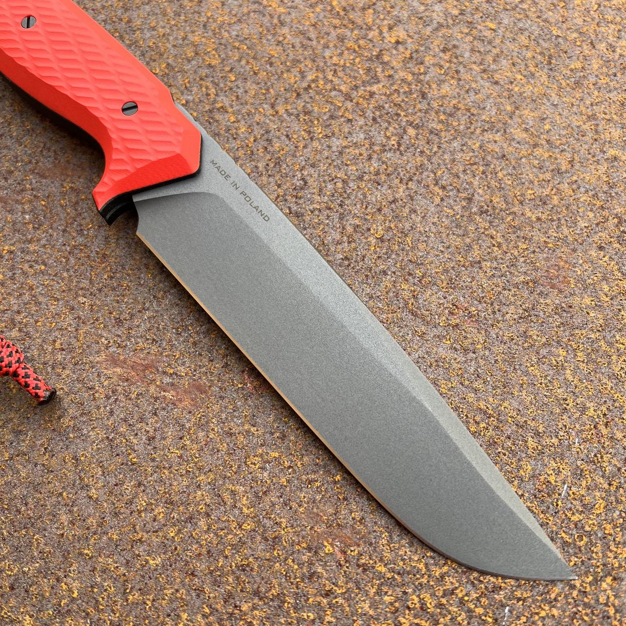 The knife has a unique construction. The construction of the handle combines the advantages of full tang and hidden tang construction. The wide tang of the knife runs along the entire length of the handle (as in the full tang), but it has been completely encapsulated with G10 composite covers twisted on it (similar to the hidden tang). This construction gives us as much durability as in the classic full tang, however, it is more pleasant for the hand working in the cold without a glove, as in the case of hidden tang knives.