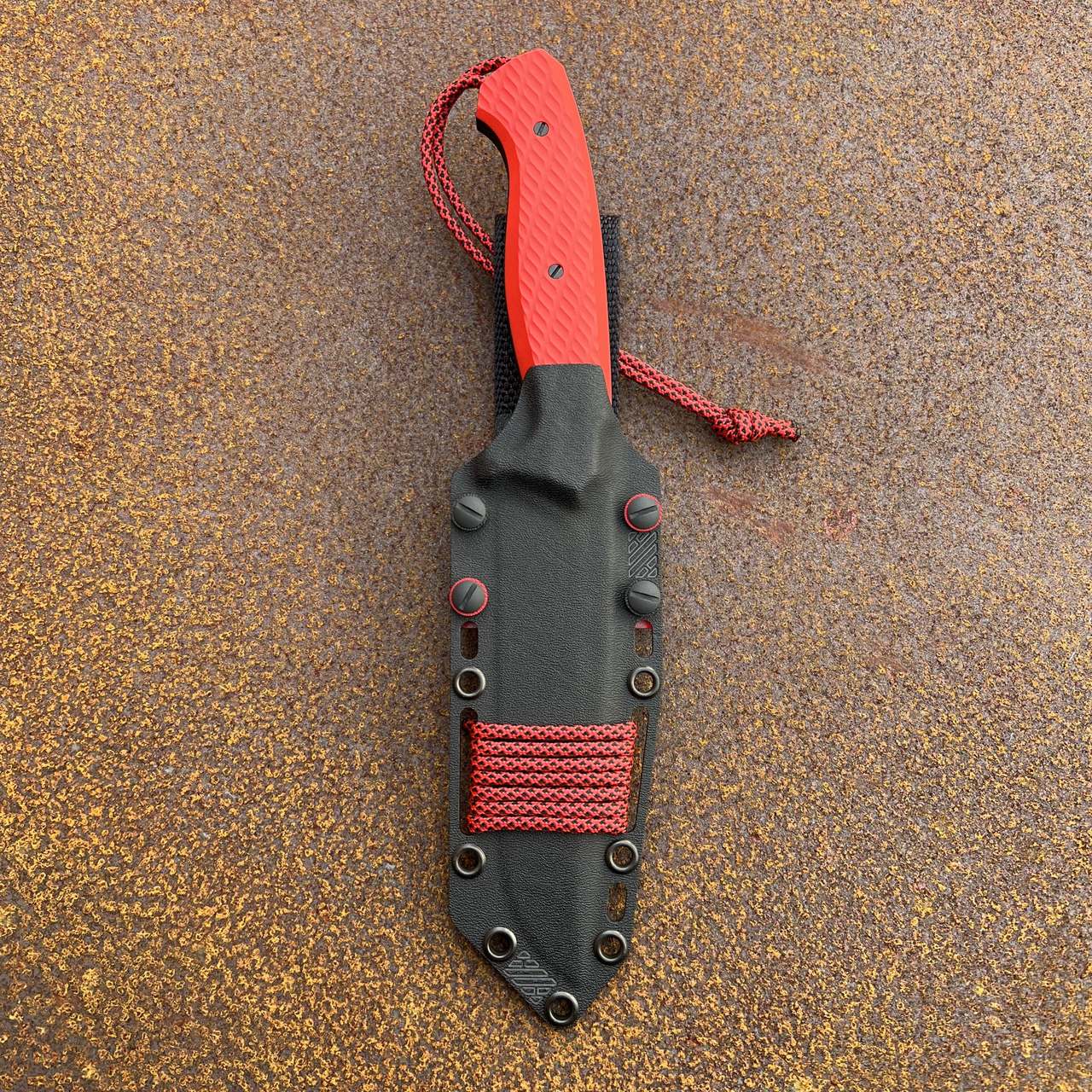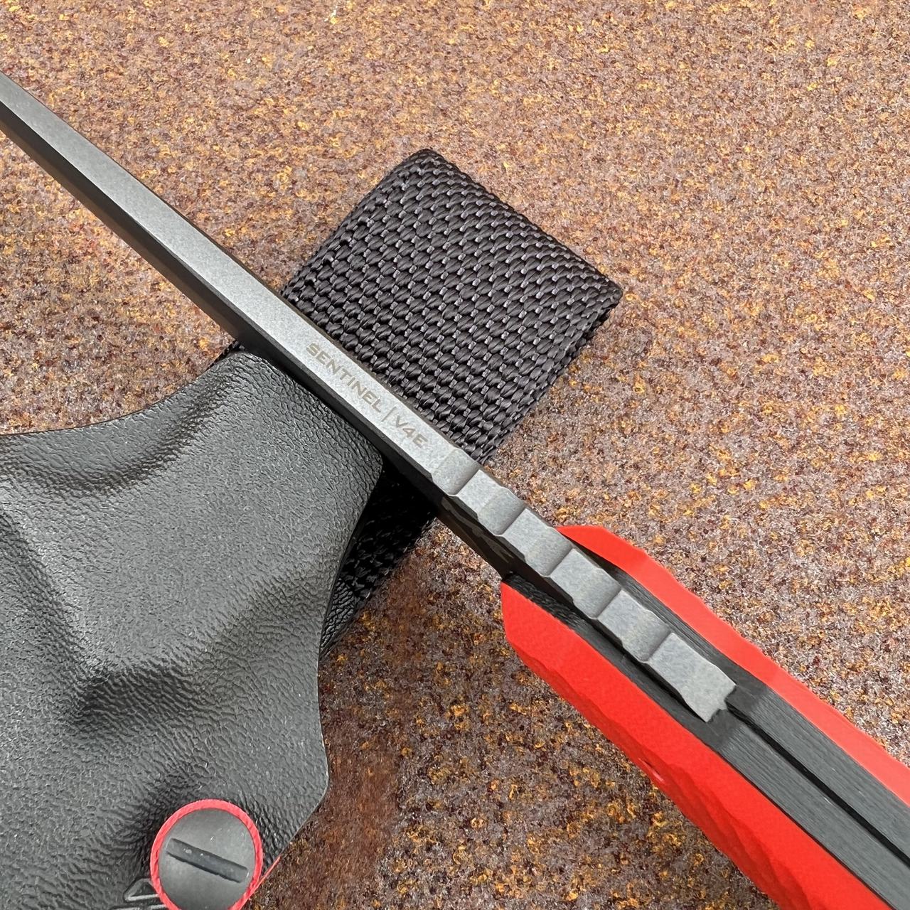 Sentinel knife is usually made of steel that can be subjected to high overload (Vanadis 4 Extra, Vanadis 23, Elmax). The knife is designed for intensive use, therefore the steel used in its production must be appropriate. It should withstand high stress, stay sharp for a long time and not chip. Sentinel is made with a variety of blade finishes (PVD coating, DLC coating). The handle is usually made of G10 composite or micarta, with a variety of colors and various original patterns. For each model, the knifemaker creates an appropriate Kydex holster, the colors of which (holster and accessories) correspond to the colors of the blade and the handle so that the whole is a coherent set.