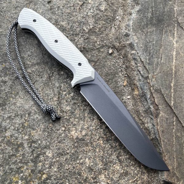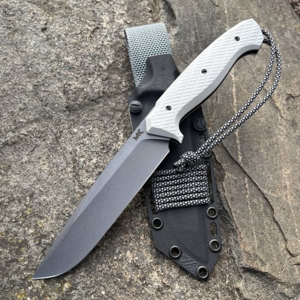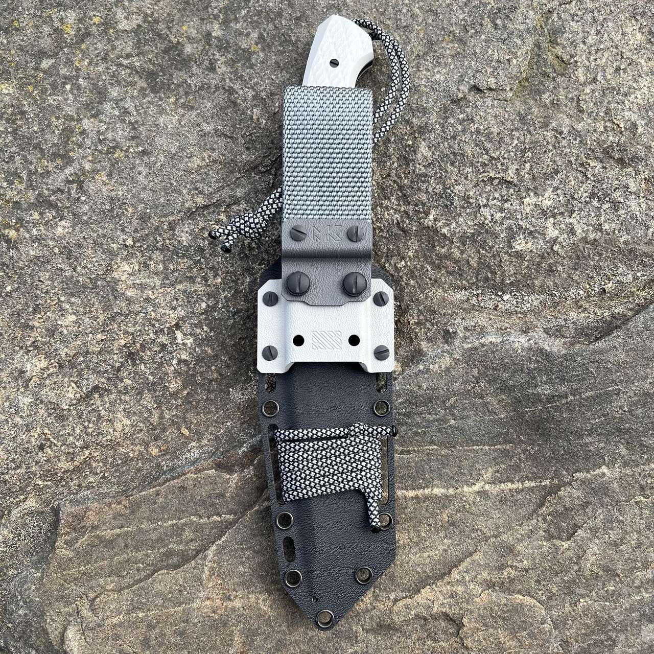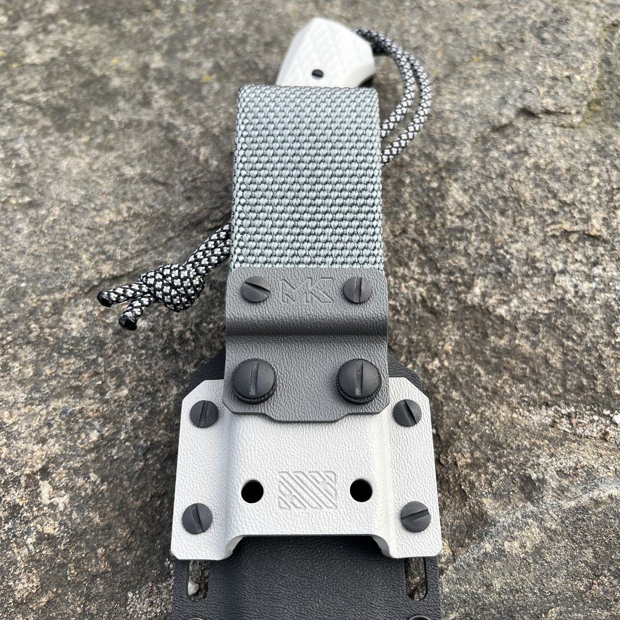 MK Knives & Tools“Grey Storm” comes with blade made of extremely durable Vandis 4 Extra steel with great hardness (approx. 63 HRC). Blade is covered by black titanium PVD coating. The knife blade with a drop point profile has been made with innovative groove grind (hollow). The handle covers made of grey and black G10 composite hide a pin for paracord or rope, etc. at the end of the handle. Knife comes with black Kydex holster with grey additions and an additional buckle designed for mounting to the MOLLE system.