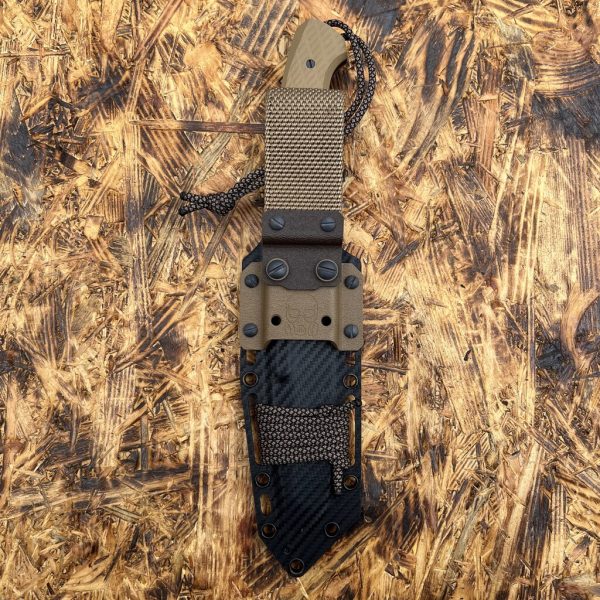 The holster is attached to the belt using a textile loop. It is equipped with pass-through holes that can be optionally used to secure the holster to a backpack or tactical gear using cordage, rope, or paracord. The holster is wrapped with paracord, matching the color of the section near the knife.
