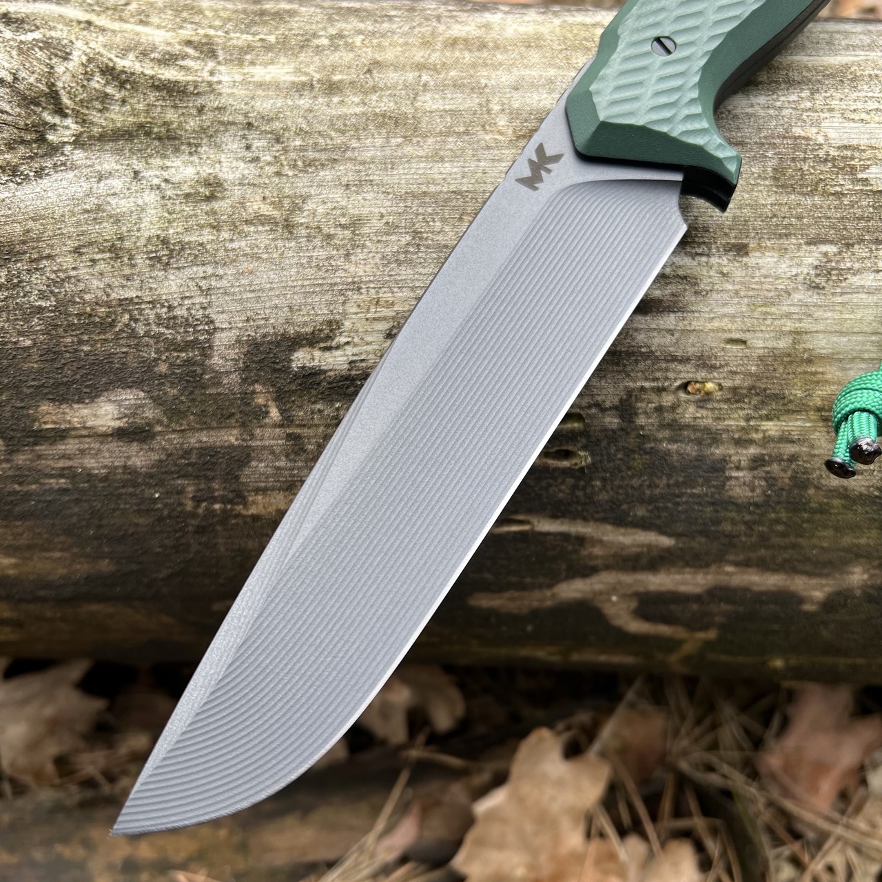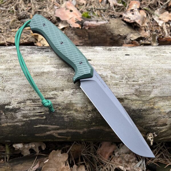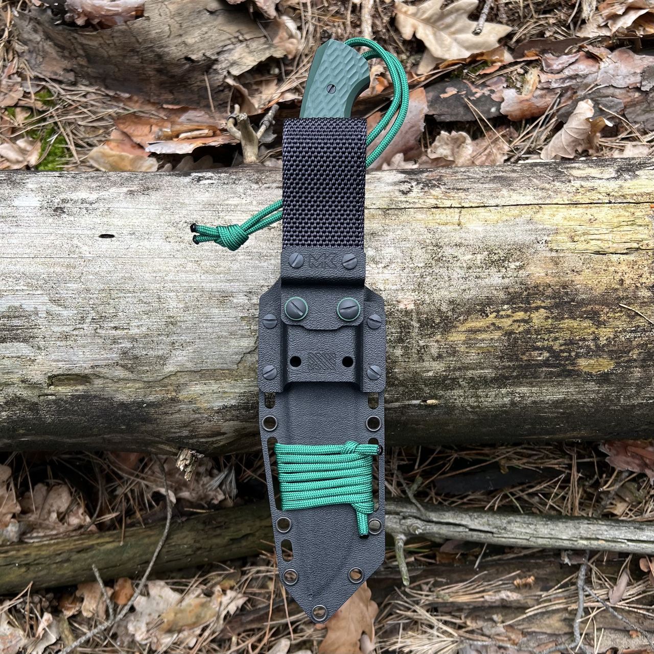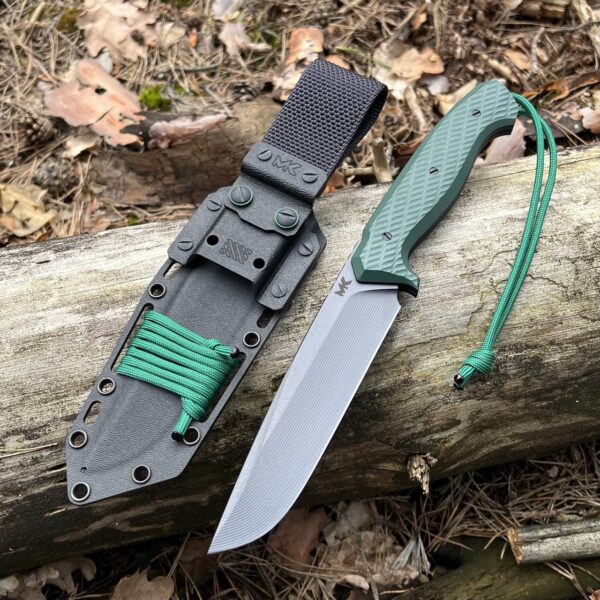 MK Knives & Tools Sentinel “Undergrowth” comes with blade made of extremely durable Vandis 4 Extra steel with great hardness (approx. 63 HRC). Blade is covered by black titanium PVD coating. The knife blade with a drop point profile has been made with innovative groove grind (hollow). The handle covers made of green and black G10 composite hide a pin for paracord or rope, etc. at the end of the handle. Knife comes with black Kydex holster and an additional buckle designed for mounting to the MOLLE system.