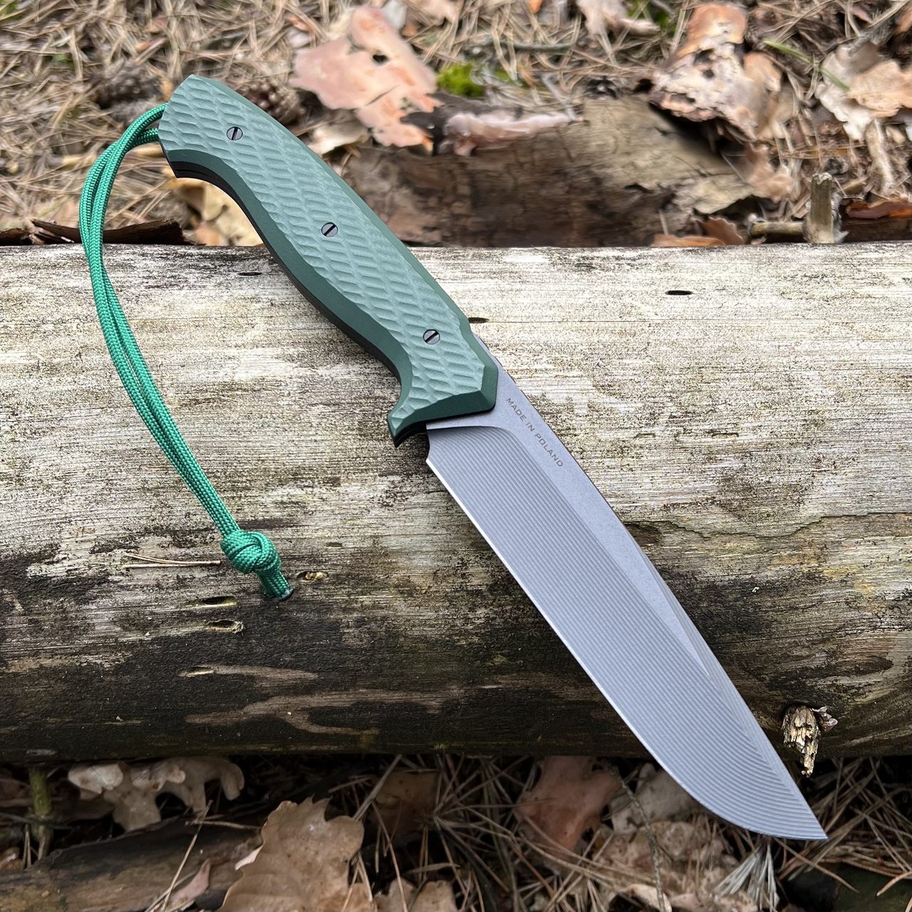 The knife has a unique construction. The construction of the handle combines the advantages of full tang and hidden tang construction. The wide tang of the knife runs along the entire length of the handle (as in the full tang), but it has been completely encapsulated with G10 composite covers twisted on it (similar to the hidden tang). This construction gives us as much durability as in the classic full tang, however, it is more pleasant for the hand working in the cold without a glove, as in the case of hidden tang knives.