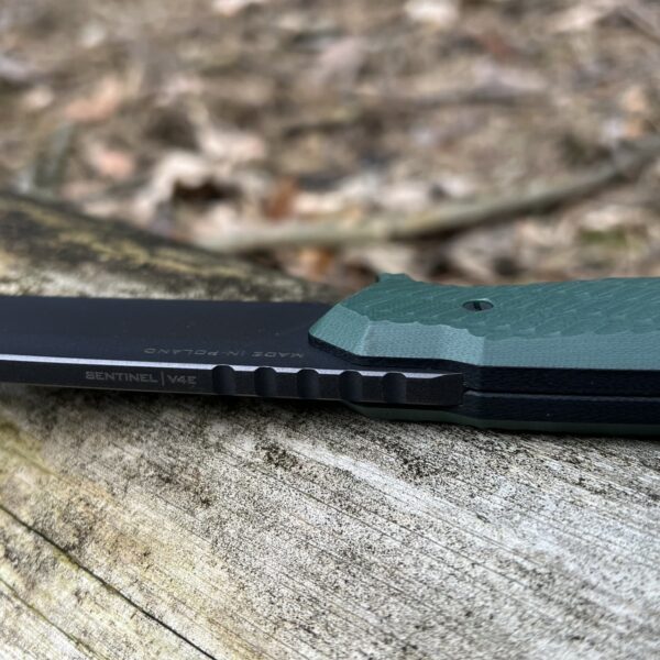 The presented Sentinel knife is made of one piece of Vanadis 4 Extra steel (features of the full tang construction). The steel used in the knife is an extremely durable material, very hard, resistant to overload, abrasion and chipping. The knife has been coated with a black PVD titanium coating (a special variety with greater thickness), which additionally strengthens the steel and improves anti-corrosion properties. The coating has anti-reflective properties, which makes the knife especially suitable for tactical use.