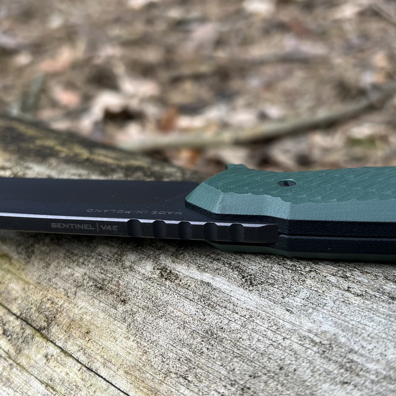 Sentinel knife is usually made of steel that can be subjected to high overload (Vanadis 4 Extra, Vanadis 23, Elmax). The knife is designed for intensive use, therefore the steel used in its production must be appropriate. It should withstand high stress, stay sharp for a long time and not chip. Sentinel is made with a variety of blade finishes (PVD coating, DLC coating). The handle is usually made of G10 composite or micarta, with a variety of colors and various original patterns. For each model, the knifemaker creates an appropriate Kydex holster, the colors of which (holster and accessories) correspond to the colors of the blade and the handle so that the whole is a coherent set.