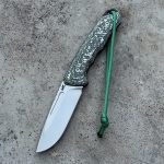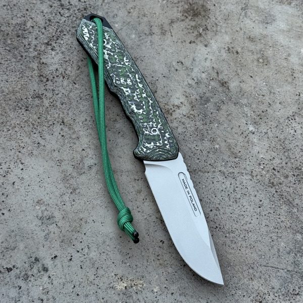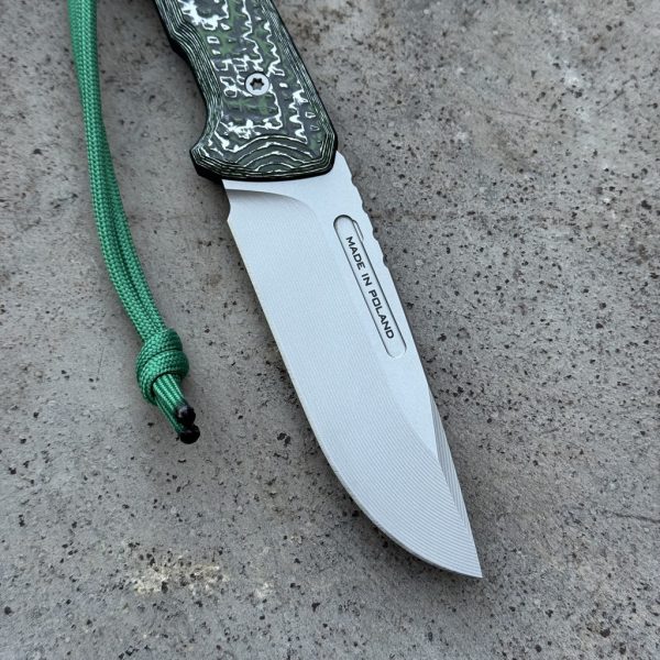 **EXCLUSIVE FATCARBON HANDLE**: The handle scales are crafted from exclusive carbon fiber produced by FatCarbon, a globally recognized manufacturer from Lithuania. The construction is further reinforced with liners made of highly durable G10 composite. G10 is resistant to moisture, temperature fluctuations, most solvents, and acids, offering exceptional mechanical durability. The textured surface of the handle scales enhances grip, preventing slippage. The scales are secured with stainless steel Torx screws, finished to match the blade.