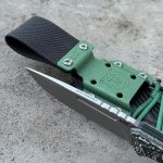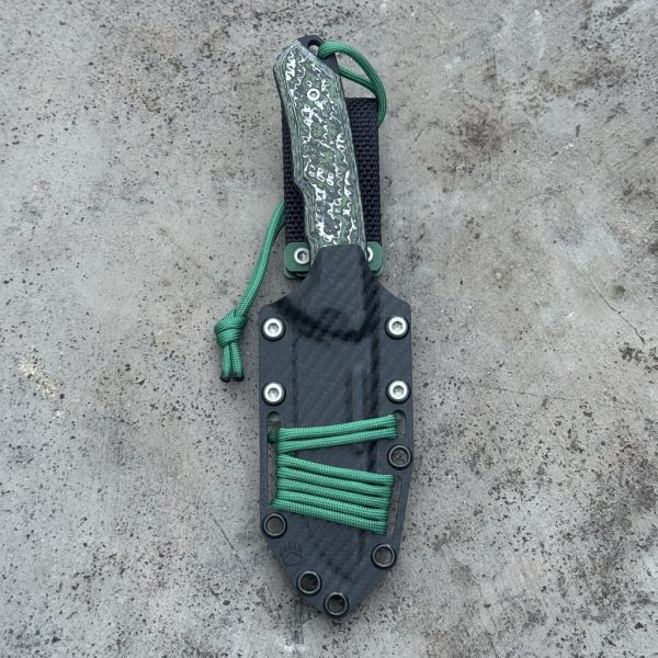 **The handle housing the tang is made of Pines Peak FatCarbon with black G10 liners. The pictograms on the holster are characteristic of the “Fear The Bear” series. The set includes a holster made of black Hostex material with a carbon pattern with green color additions.
