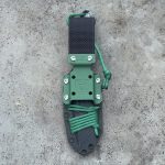 **LANYARD HOLE**. At the end of the knife handle, there is a pin made from G10 for attaching an additional lanyard. This can help prevent dropping the knife during use or provide an extra grip for easier withdrawal from the sheath. This solution also helps secure the knife against loss. A piece of paracord in a color matching the design is originally included with the knife.