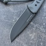 - Handle: Charcoal gray G10 with black liners and marbled carbon fiber inserts