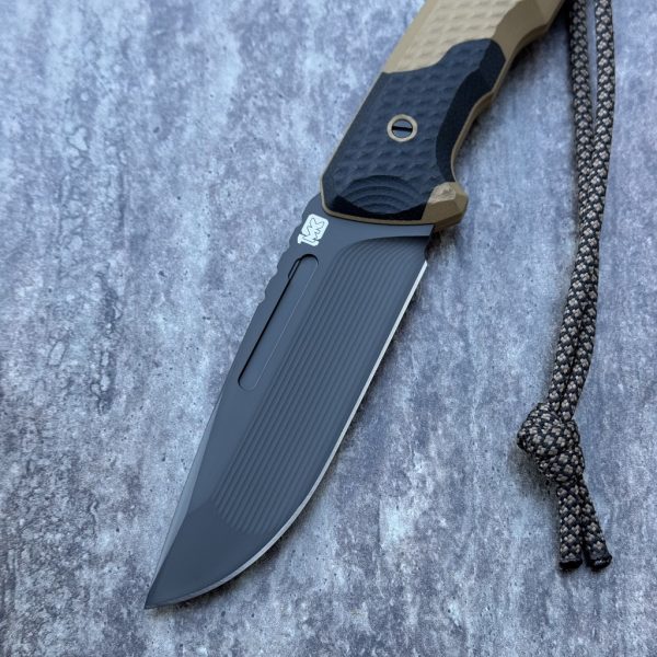 - Blade: Fixed blade (full tang), drop point style with groove grind (GG – Groove Grind / hollow), double-sided fuller, plain cutting edge
