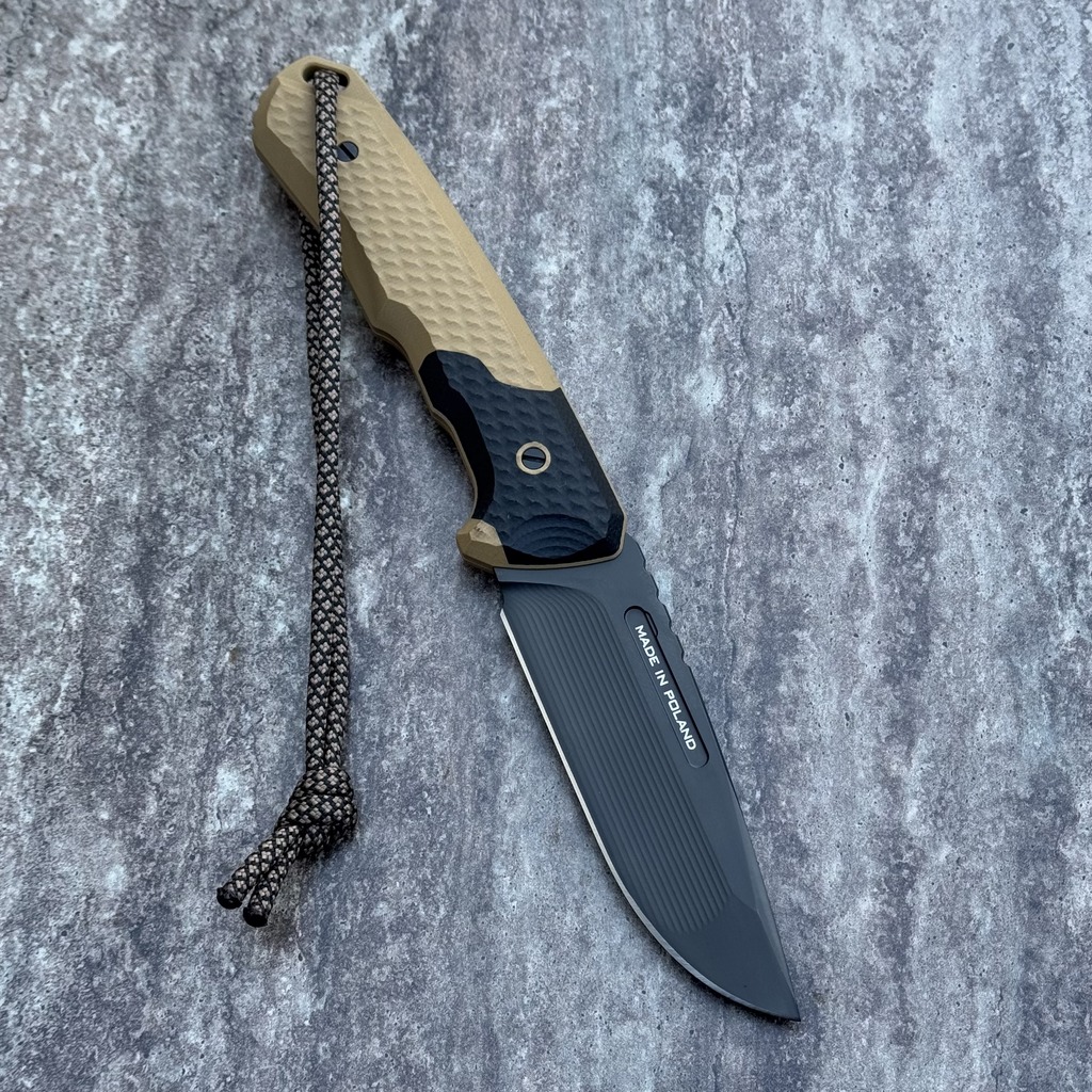**LANYARD HOLE**. At the end of the knife handle, there is a pin made from G10 for attaching an additional lanyard. This can help prevent dropping the knife during use or provide an extra grip for easier withdrawal from the sheath. This solution also helps secure the knife against loss. A piece of paracord in a color matching the design is originally included with the knife.