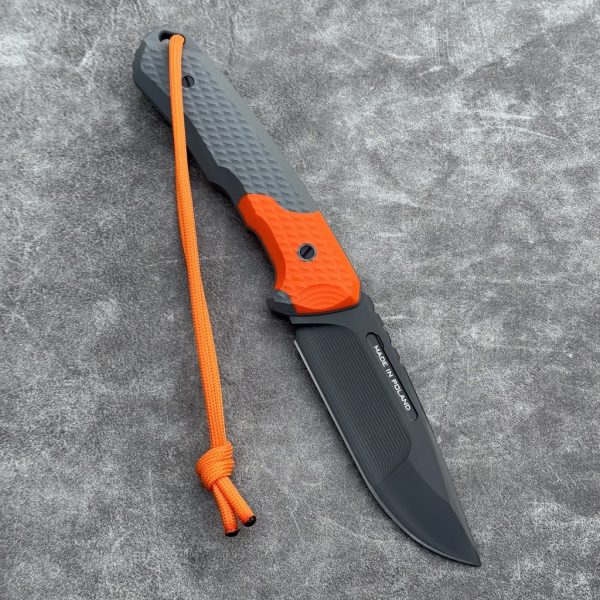 **LANYARD HOLE**. At the end of the knife handle, there is a pin made from G10 for attaching an additional lanyard. This can help prevent dropping the knife during use or provide an extra grip for easier withdrawal from the sheath. This solution also helps secure the knife against loss. A piece of paracord in a color matching the design is originally included with the knife.