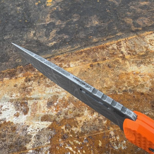 **The Featured Venn Knife has a blade made of high-quality Becut stainless steel with a distinctive finish. The blade features a **2-Step Groove Grind**, where the front half near the tip has a fine grooved texture, while the section closer to the handle is thicker with coarser grooves. The thinner front section is perfect for precision work, piercing materials, and food preparation. The thicker portion is more durable and ideal for carving, sharpening sticks, and making tinder for a fire. The spine of the blade is adorned with a double-sided fuller, enhancing balance.