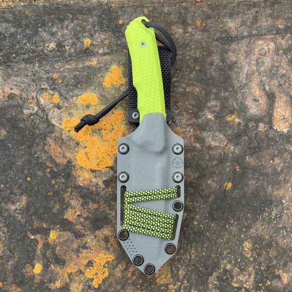**LANYARD HOLE**. At the end of the knife handle, there is a pin made from G10 for attaching an additional lanyard. This can help prevent dropping the knife during use or provide an extra grip for easier withdrawal from the sheath. This solution also helps secure the knife against loss. A piece of paracord in a color matching the design is originally included with the knife.