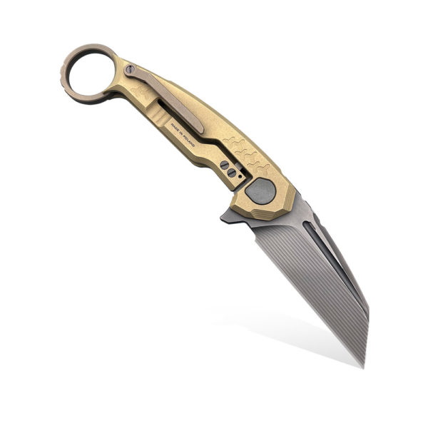 The handle is entirely made of light and extremely durable titanium (Desert Fox anodized). It is a hard metal, resistant to impact and mechanical damage, used in knives of the highest quality. It is resistant to corrosion. The scales have been screwed with stainless steel screws in a color consistent with the entire design (PVD coating). The knife is equipped with a brown titanium pocket clip, allowing for stable carrying in a pocket, mounting in a backpack, organizer, kidney, etc. The knife has brown titanium backspacer color matched to the clip that seamlessly transitions into a karambit-style finger hole.