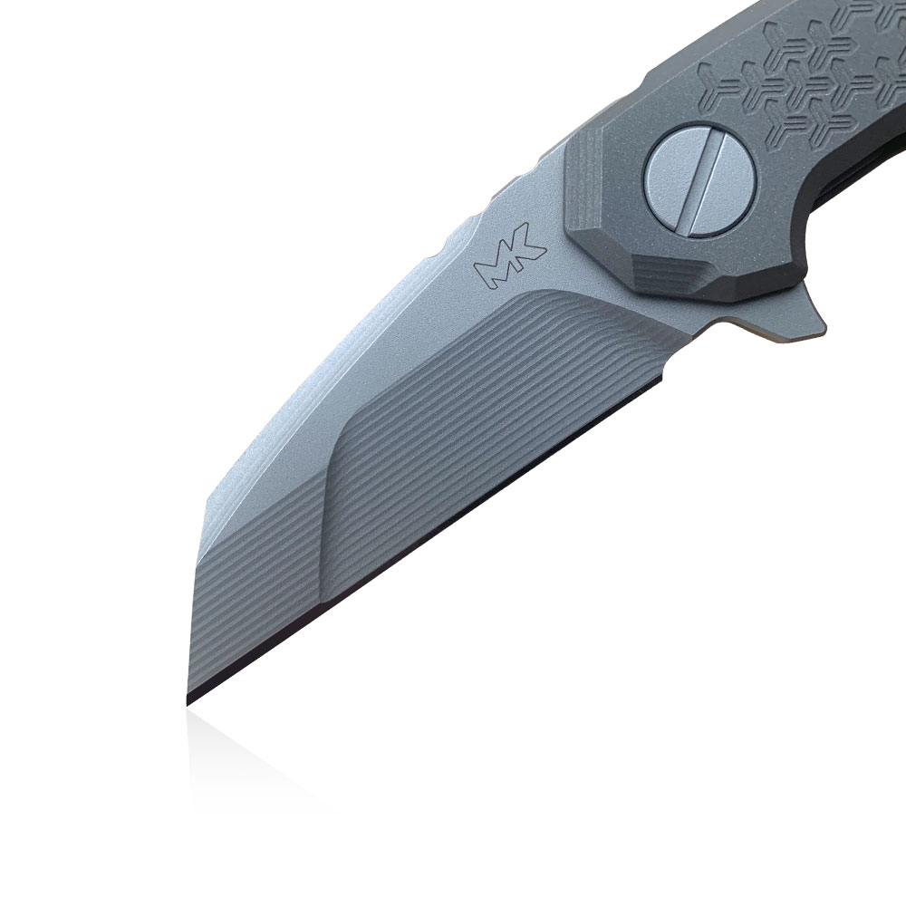 The handle is entirely made of light and extremely durable titanium. It is a hard metal, resistant to impact and mechanical damage, used in knives of the highest quality. It is resistant to corrosion. The covers have been screwed with stainless steel screws in a color consistent with the entire design. The knife is equipped with a titanium pocket clip, allowing for stable carrying in a pocket, mounting in a backpack, organizer, kidney, etc. The knife has titanium backspacer with a hole designed for threading an additional line, paracord, etc. Both the clip and the hole are elements that protect against possible knife loss. The hole can also be used to attach an additional ornament in the form of a knife bead etc. MK knife beads you can find HERE.