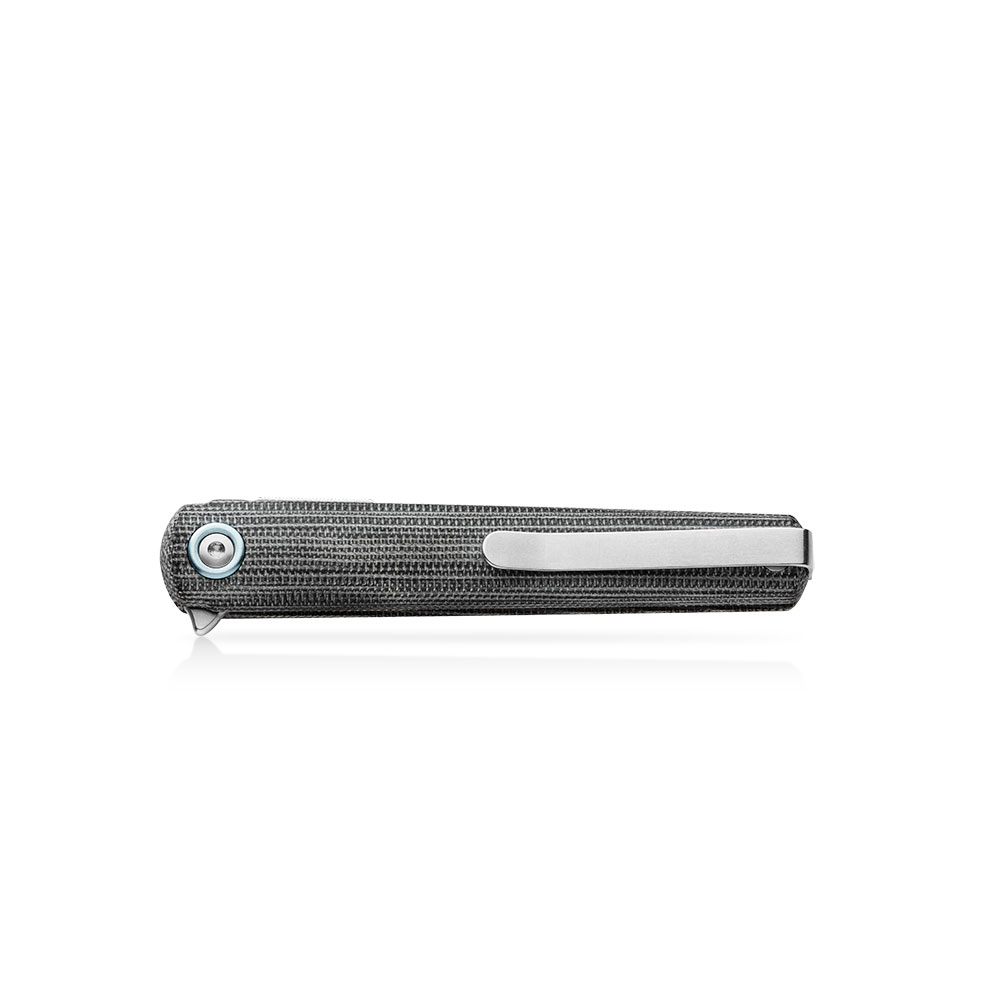 The handle scales are made of Black Canvas Micarta laminate on steel liners. Micarta is resistant to moisture, temperature changes, most solvents and acids, has high resistance to mechanical damage. At the end of a handle there is a pocket clip for right or left carry (Tip Up).