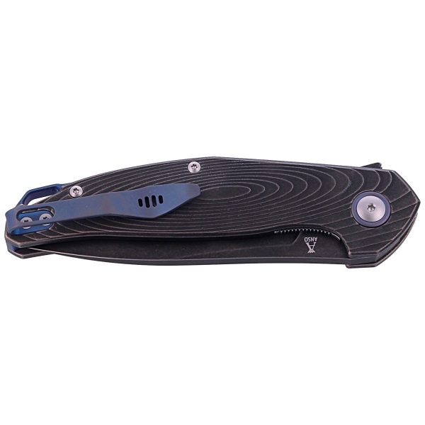 Rękojeść noża Goccia Dark Stonewash Titanium składa się z dwóch płyt z tytanu klasy 5 (Ti6AI4V), wykończonych metodą “dark stonewash”, które zostały perfekcyjnie wyfrezowane na obrabiarkach numerycznych 3D w eliptyczne okręgi. Projekt Jensa Ansø doskonale łączy estetykę z funkcjonalnością, zapewniając doskonałą ergonomię i pewny chwyt. Eliptyczne okręgi nie tylko wyglądają pięknie, ale również zwiększają pewność uchwytu. Dodatkowym elementem ozdobnym jest kołnierz wokół pivota, wykonany z anodowanego na niebiesko tytanu. Wewnątrz wyfrezowanych okładzin znajduje się blokada Liner Lock. W tylnej części rękojeści znajduje się masywny, tytanowy backspacer, również anodowany na niebiesko, z charakterystycznym dla Jensa Ansø otworem lanyard hole, który może służyć do przewleczenia linki zabezpieczającej lub ozdobnej. Prawostronny, jednopozycyjny tytanowy klips typu deep carry pozwala przenosić dyskretnie nóż w pozycji tip-up (ostrzem do góry).
