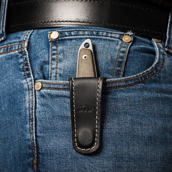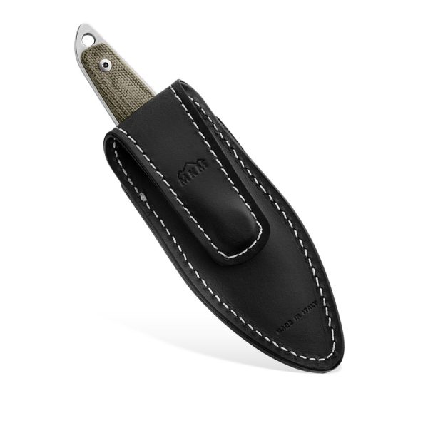 Makro 2 has a Full Tang construction, a sheepsfoot blade with a flat grind. The M390 steel blade has a stonewash finish. The handle is made of patterned green micarta. The black leather sheath allows for vertical carry and has a magnetic clip.