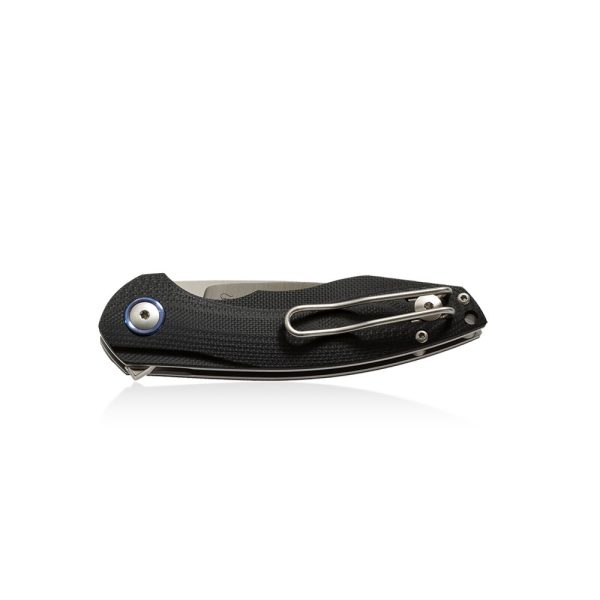 The handle scales are made of Black G10 on steel liners. G10 is resistant to moisture, temperature changes, most solvents and acids, has high resistance to mechanical damage. At the end of a handle there is a lanyard hole and wire pocket clip for Tip Up carry.
