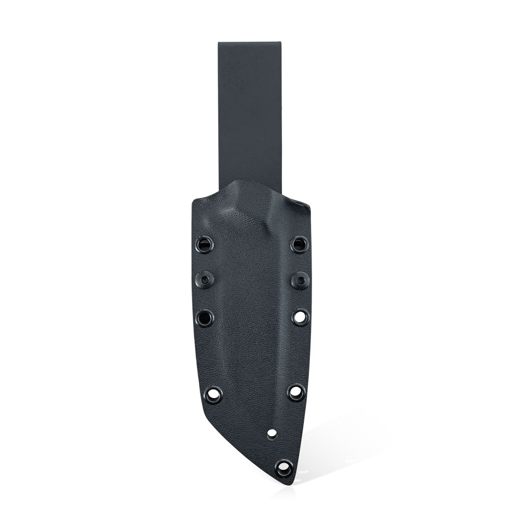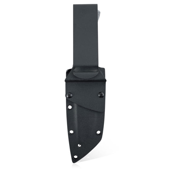The Infinity knife is equipped with a black kydex holster for carrying and storing it. Kydex is characterized by high impact and scratch resistance, low moisture absorption, resistance to various weather conditions and many chemicals. Holsters made of it are used comfortably and long-term. The holster is attached to the belt with a vertical kydex buckle. The knife holster is equipped with through pins to which you can attach a flint (not included) or other equipment. They can also be used to mount a knife, e.g. to a backpack, a harness element or a Molle® solution.