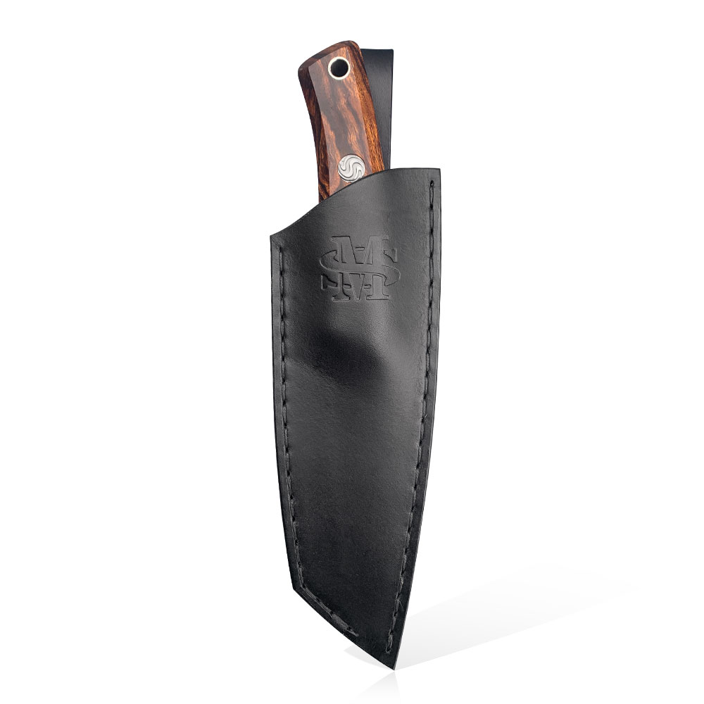 The Infinity knife comes with a leather sheath for carrying. The sheath is completely handmade from high-quality vegetable-tanned Italian leather. The stitches were made with thick threads with a massive stitch. The edges are nicely finished, smoothing them. The leather is black and has the MS Knives logo on its front. The sheath has a belt clip.