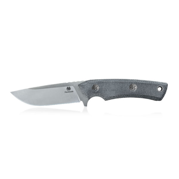 Grips are made of Black Canvas Micarta laminate, resistant to moisture, temperature changes, most solvents and acids, with high resistance to mechanical damage. Micarta, known for its excellent properties, also visual (it can be styled like a natural material), has a non-slip, rough structure. The linings were glued and screwed with sandblasted stainless steel screws. The screws are quite a characteristic detail of the knife, due to the original pattern on them.