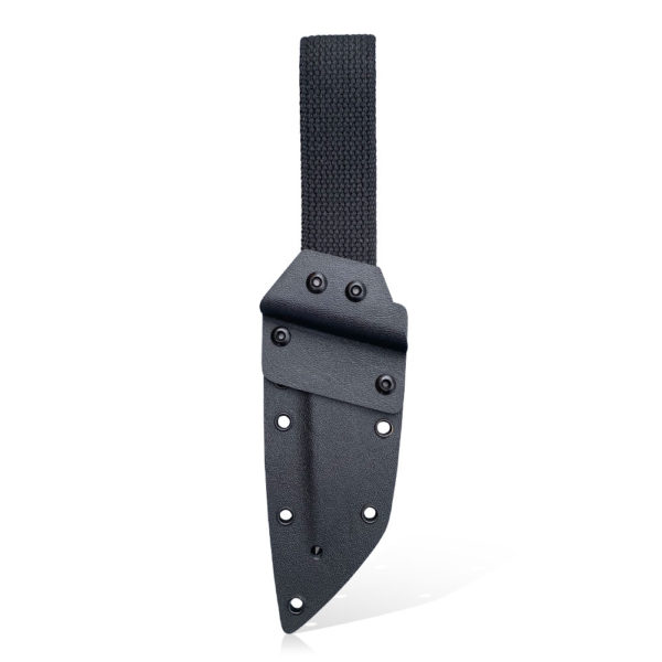The Liberty knife is equipped with a black kydex holster for carrying and storing it. Kydex is characterized by high impact and scratch resistance, low moisture absorption, resistance to various weather conditions and many chemicals. Holsters made of it are used comfortably and long-term. The holster is attached to the belt by nylon loop. The knife holster is equipped with through pins to which you can attach a flint (not included) or other equipment. They can also be used to mount a knife, e.g. to a backpack, a harness element or a Molle solution.