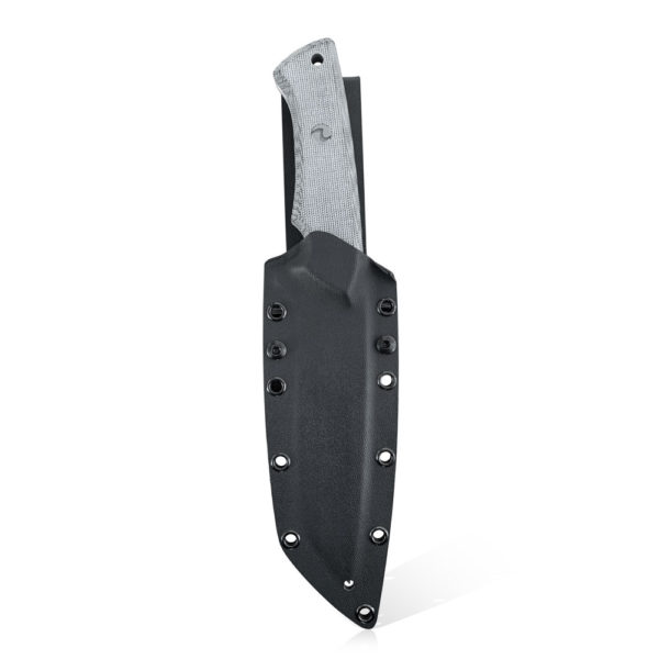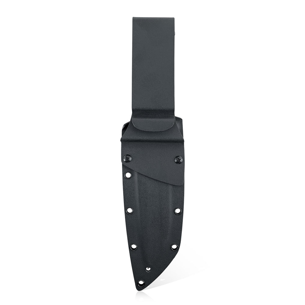 The Shark knife is equipped with a black kydex holster for carrying and storing it. Kydex is characterized by high impact and scratch resistance, low moisture absorption, resistance to various weather conditions and many chemicals. Holsters made of it are used comfortably and long-term. The holster is attached to the belt with a vertical kydex buckle. The knife holster is equipped with through pins to which you can attach a flint (not included) or other equipment. They can also be used to mount a knife, e.g. to a backpack, a harness element or a Molle® solution.