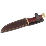 Rękojeść noża została zakończona mosiężną głowicą, a jej profilowane okładziny wykonane z laminowanego drewna pakka w brązowym kolorze zapewniają pewny i bezpieczny chwyt, który doskonale sprawdza się w każdych warunkach.