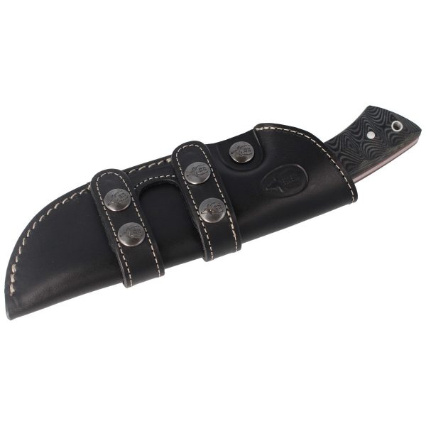 Pochwa noża RHINO-10SV.M to nie tylko element ochrony, ale i eleganckiego wykończenia. Wykonana jest z dobrze wyprawionej, naturalnej skóry wołowej w kolorze czarnym. Płaszcz pochwy zdobi tłoczone logo producenta, a kaburę można zapinać na solidne zatrzaski Prim. Pochwę przeszyto na brzegach ozdobną nicią. Mocowanie do pasa lub oporządzenia umożliwia przenoszenie noża w pozycji pionowej lub poziomej.