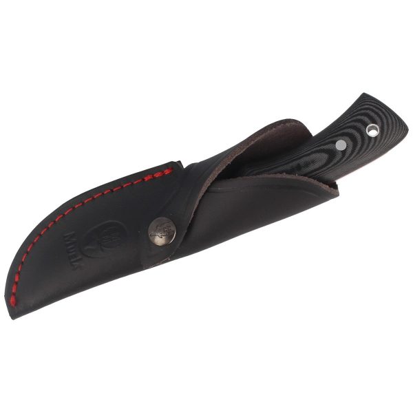 Nożyk zapakowany jest w eleganckie etui ze skóry w kolorze czarnym z tłoczonym logiem firmy Muela, zapinanym na zatrzask. Pochwa została przeszyta czerwoną ozdobną nicią na brzegach. Dzięki specjalnemu mocowaniu, możesz nosić swój nóż na pasku lub oporządzeniu w pozycji pionowej – zawsze gotowy do działania.
