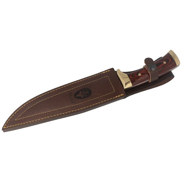 Rękojeść jest profilowana i pokryta barwionymi lakierowanymi okładzinami z drewna pakka w kolorze brązowym. To dodaje nożowi ekskluzywnego wyglądu oraz zapewnia pewny chwyt. Rękojeść została zakończona ozdobną mosiężną polerowaną głowicą.